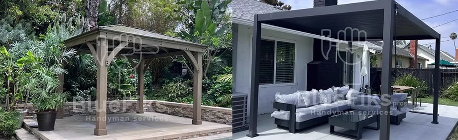 Gazebos and Pergolas: These require precision, often involving roofing and anchoring to a concrete or wooden deck.